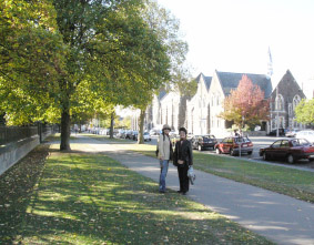 黄葉がきれいな通り。左の塀の向こうがクライストチャーチ植物園