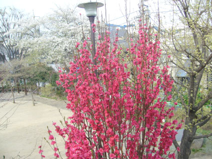 手前の派手な花はハナモモ。実をつけない観賞用のモモです。
