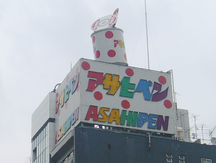 ここはアサヒペンのビルですが、このペンキ缶の広告塔、歩行者目線だと上のほうの細工がよく見えないのですが、2階建てバスからはこの通りばっちり見えます。