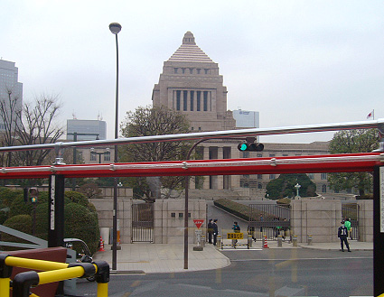 向かって左が衆議院、右が参議院。平等を表すために建物は左右まったく対称に造られているとのこと。