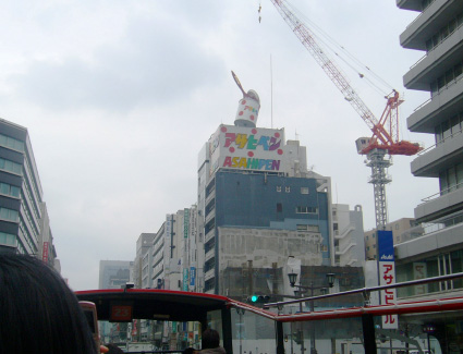 ここはアサヒペンのビルですが、このペンキ缶の広告塔、歩行者目線だと上のほうの細工がよく見えないのですが、2階建てバスからはこの通りばっちり見えます。