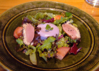 前菜は「紫芋のムース鴨のロースト野菜サラダ添え」。