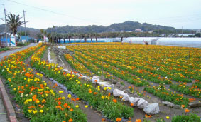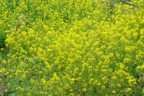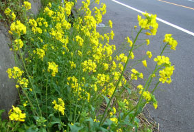 道路脇は延々と菜の花が黄色いベルトのように続いていました。